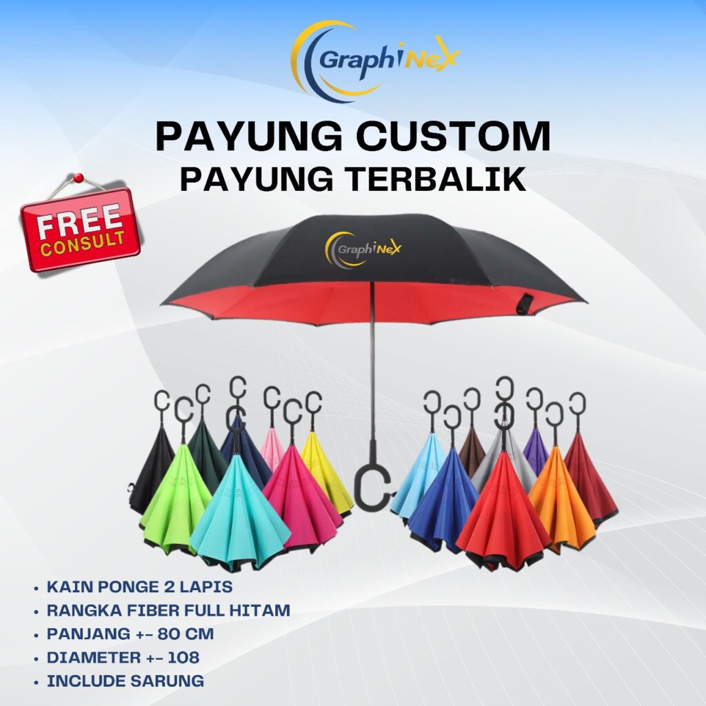 Jadikan musim hujan lebih praktis dan stylish! Pesan Payung Terbalik custom dengan logo Anda sekarang. Hubungi kami untuk info lebih lanjut.