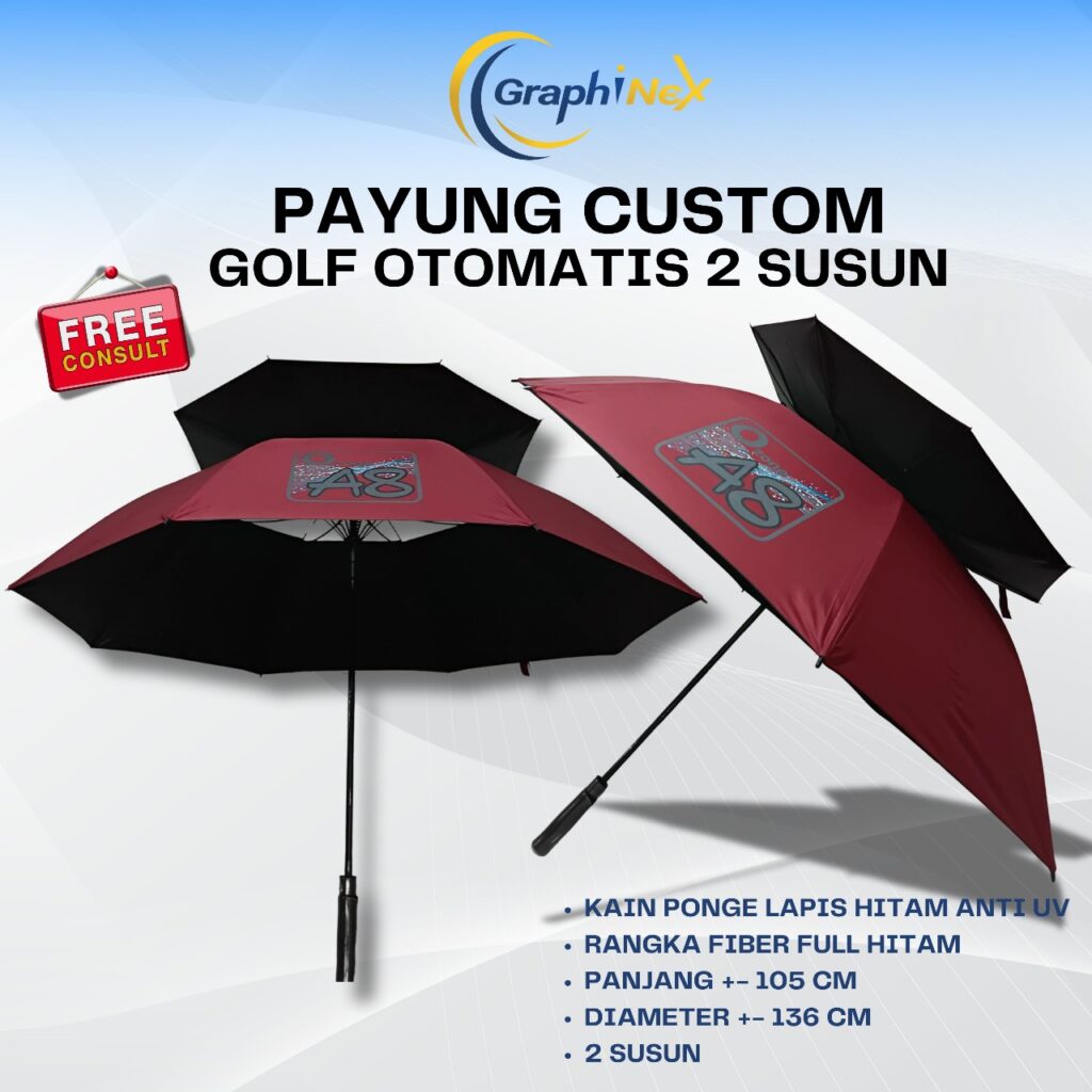 Nikmati perlindungan maksimal dengan Payung Custom Golf Otomatis 2 Susun. Desainnya yang inovatif dan fungsional menjadikan payung ini pilihan premium untuk menghadapi berbagai kondisi cuaca. Sangat cocok sebagai media promosi yang efektif dan elegan.